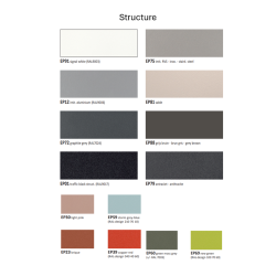 EP91- BLANC STRATIFIE HP90 - BLANC STRATIFIE HP93 - CRAIE EP01 - NOIR STRATIFIE HP98 - MARBRE EP72 - GRAPHITE EP79 - ANTHRACITE STRATIFIE HP06 - MARBRE NOIR STRATIFIE HP07 - ARPAS SAMAS EP75 - IMITATION INOX EP12 - IMITATION ALUMINIUM STRATIFIE HP03 - GRIS LUNE EP88 - BRUN STRATIFIE HP81 - CHÊNE STRATIFIE HP88 - NOYER EP87 - TAUPE EP81- SABLE STRATIFIE HP96 - TIVOLI GREIGE TRAVERTIN EP60 - VERT MOUSSE STRATIFIE HP76 - MARBRE LUGANO EP69 - VERT ANIS EP59 - BLEU EP30 - ROSE EP39 - ROUGE EP23 - BRIQUE